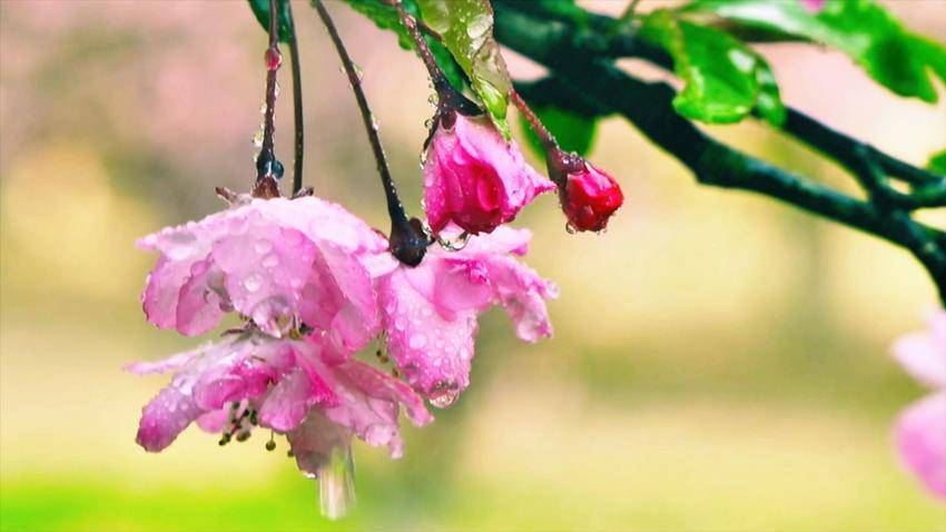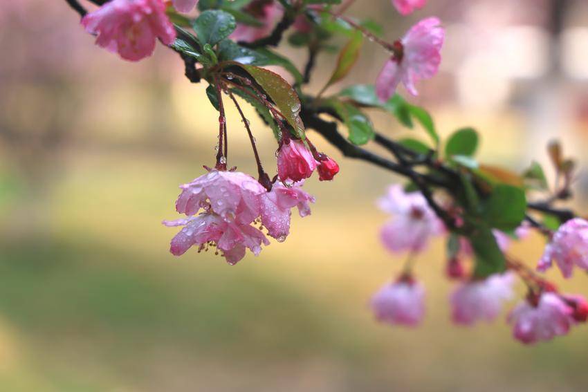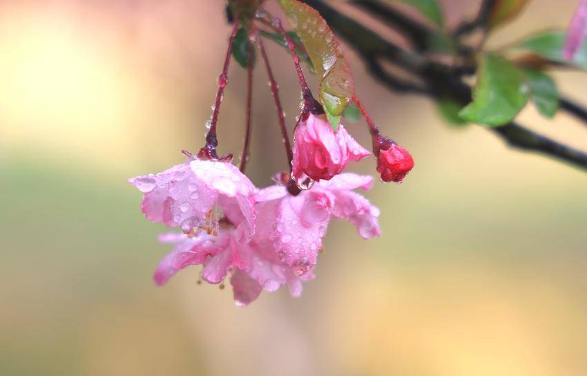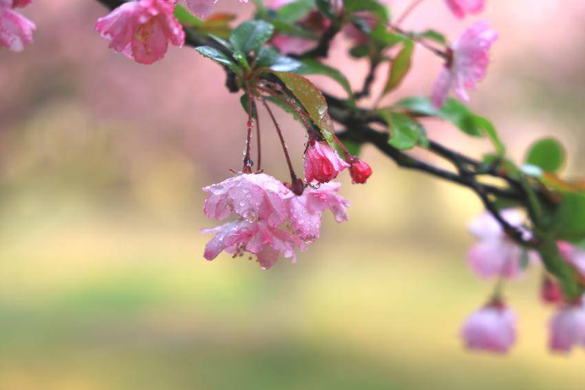 粉白花瓣层叠轻绽,薄如蝉翼,浅晕胭脂,在暖阳里漾开温柔柔光。柔枝轻垂,露珠凝缀花间,微风轻拂便摇曳生姿,落一地细碎芳影,轻染街巷尘香。